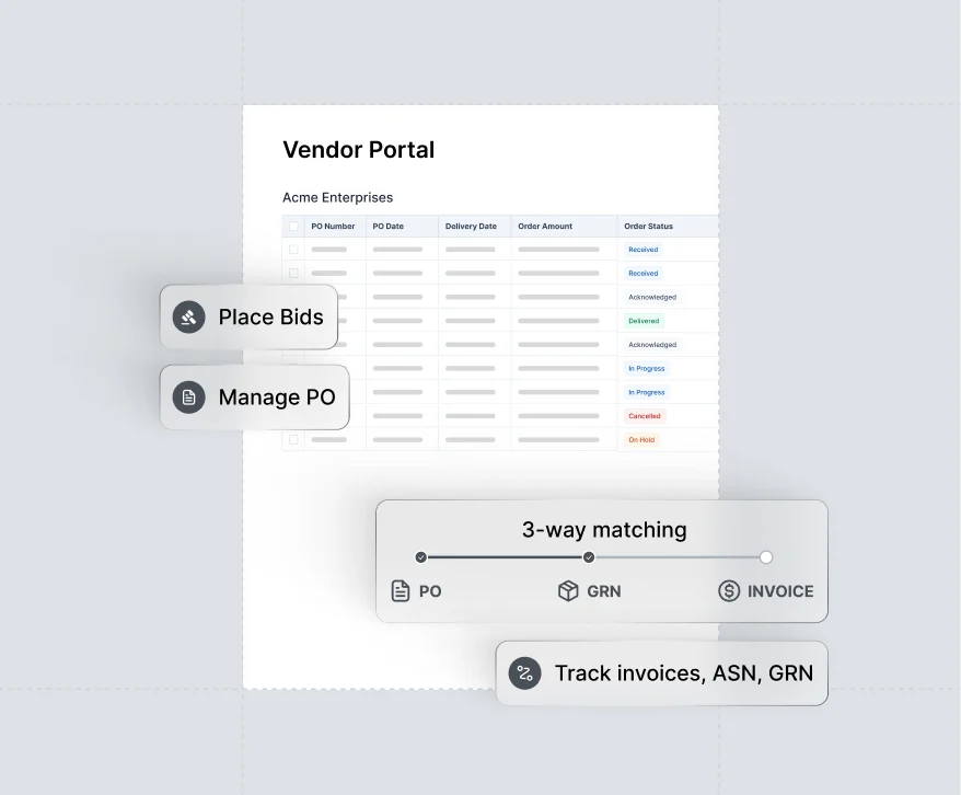 Centralize vendor interactions and performance monitoring in one platform. Vendors can also upload invoices with our built-in OCR and communicate instantly with the buyer.