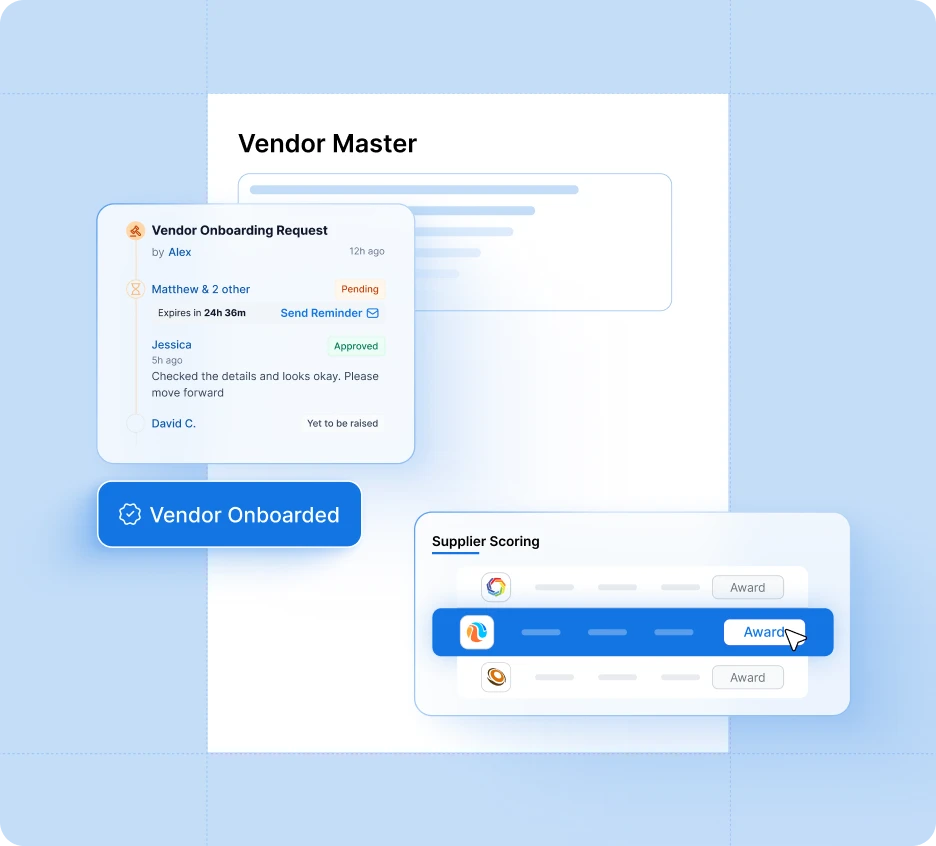 Onboard suppliers seamlessly with personalized registration forms and automated vendor due diligence, thus eliminating the need for manual follow-ups or shared spreadsheets. Make sure money doesn’t fall into the wrong hands by maintaining compliance at all times.